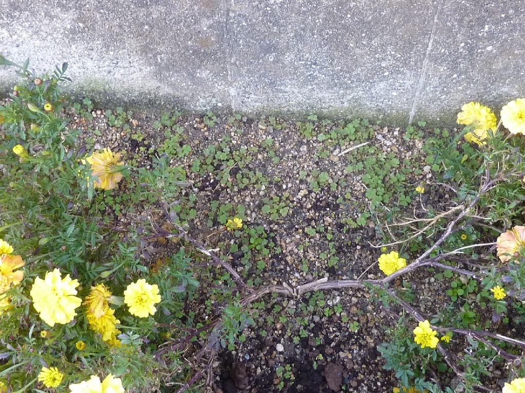 ちゃっかりマリーゴールドの下に隠れて生えてます