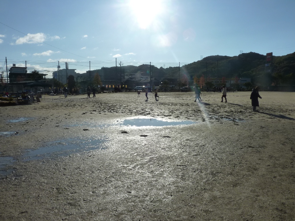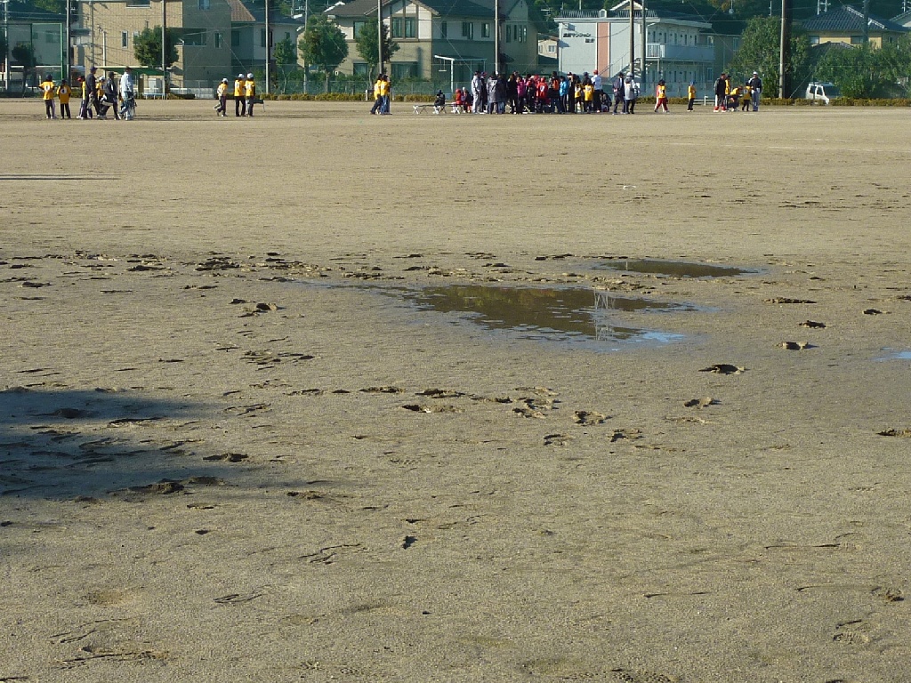 でグランドの所々に水溜りが…